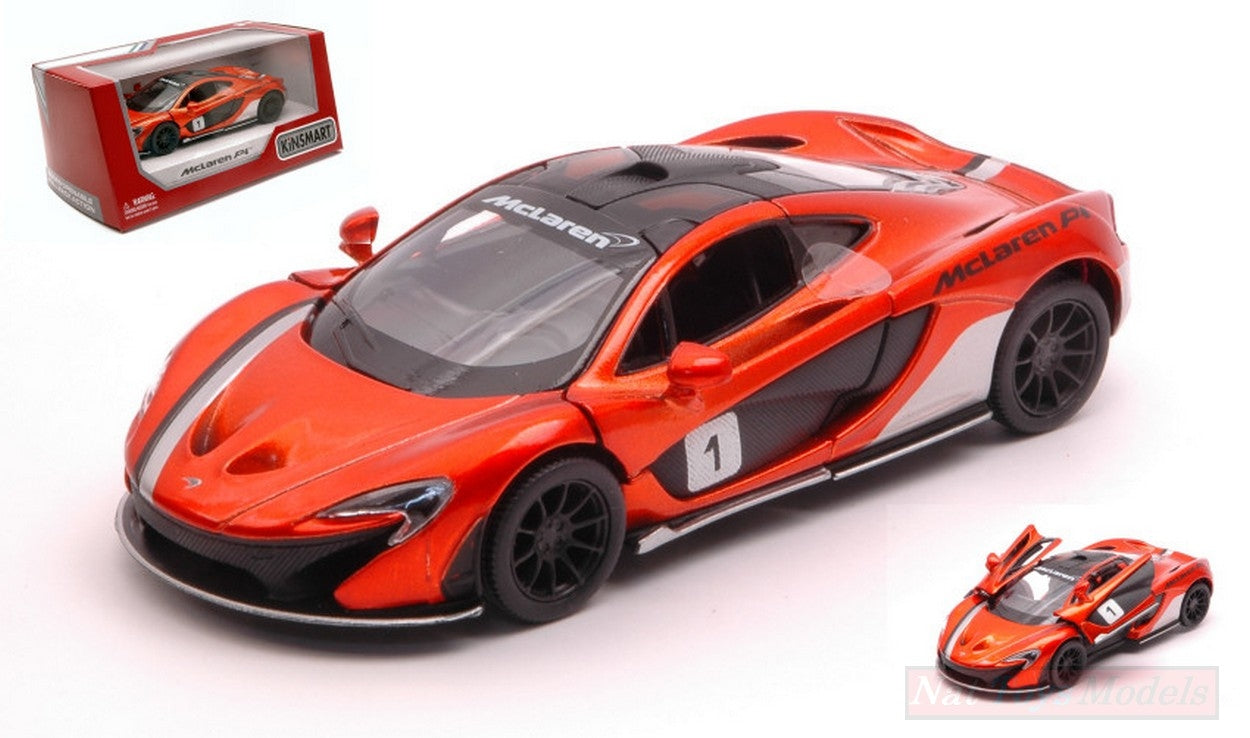MODELLINO IN SCALA COMPATIBILE CON MC LAREN P1 WITH STRIPES ORANGE METALLIC cm 12 BOX KINSMART KT5393WFO