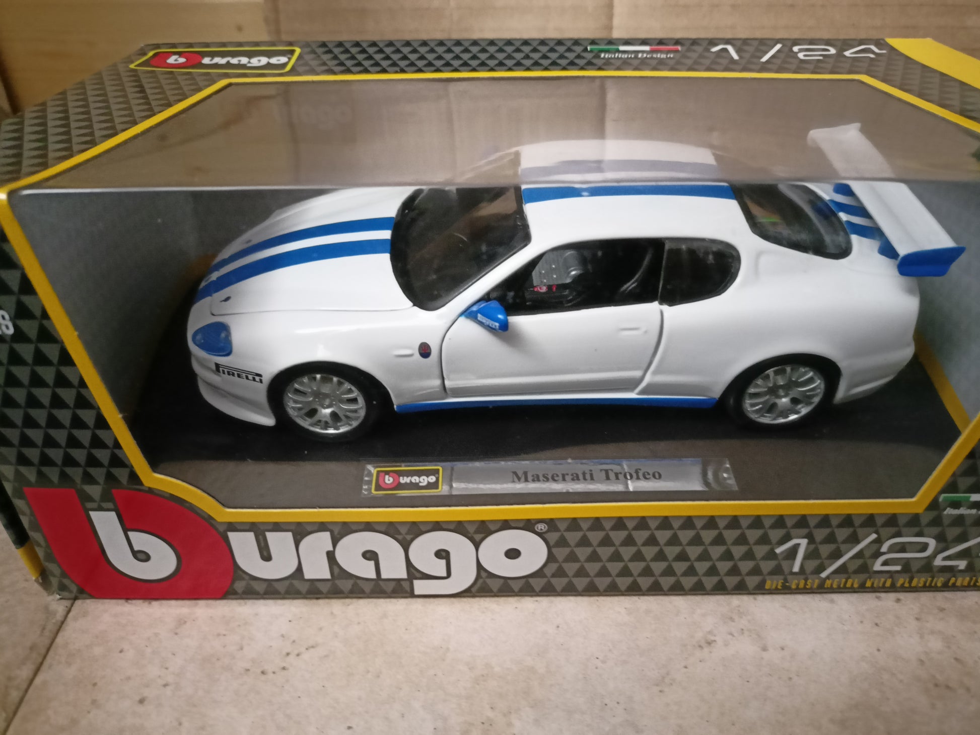 MODELLINO IN SCALA BURAGO COMPATIBILE CON MASERATI TROFEO W/BLUE STRIPES 1:24 BU22097BL 241220 DIE CAST MODEL